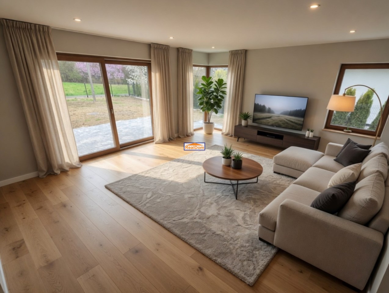 - salon ok. 35 m² – serce domu, dużo światła i przestrzeni
