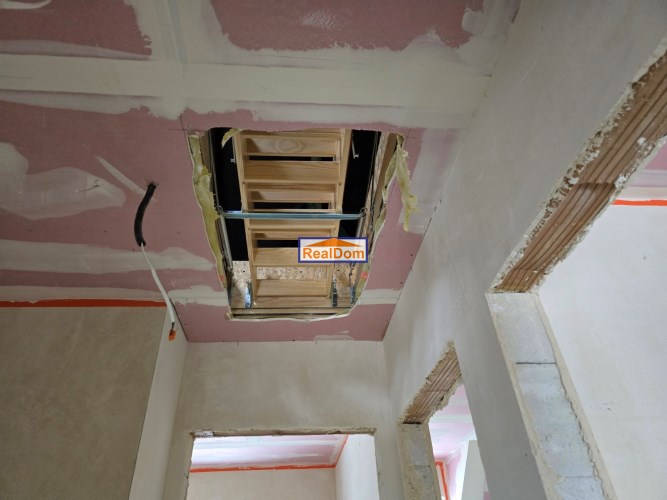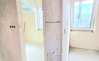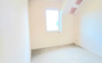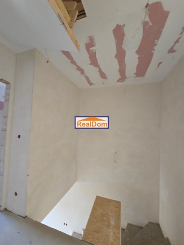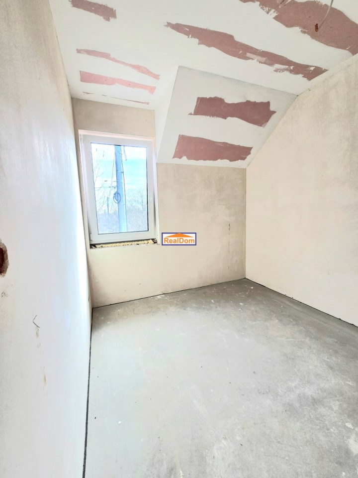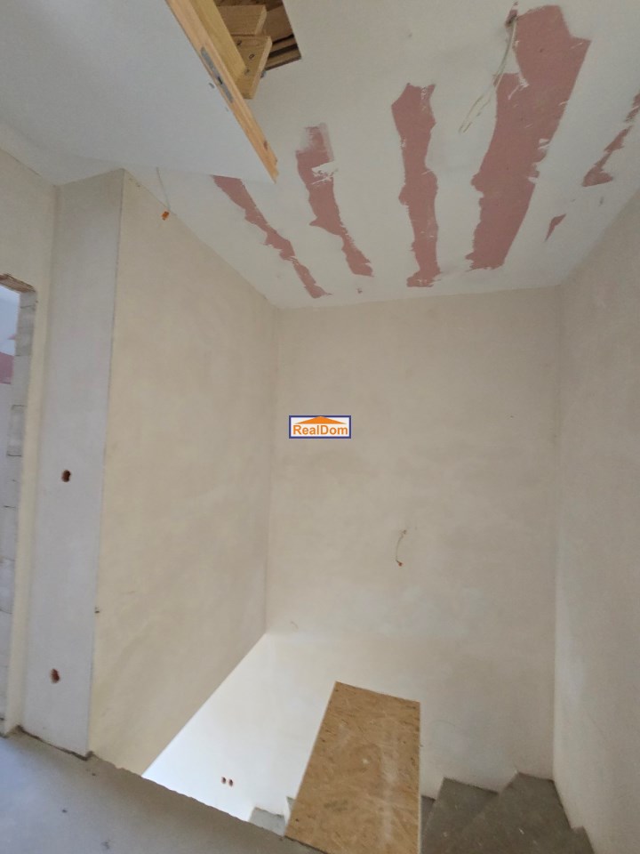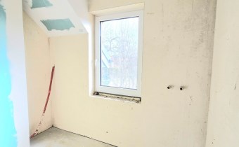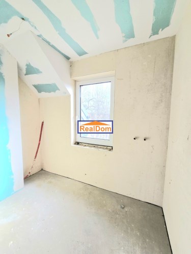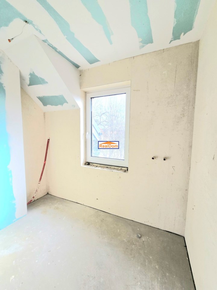 Rozkład pomieszczeń: • Parter: wiatrołap, łazienka, salon z aneksem kuchennym (kuchnia z oknem) • Piętro: 3 ustawne pokoje, duża łazienka • Dodatkowo: strych do przechowywania (wysokość w najwyższym punkcie ponad 2 m)