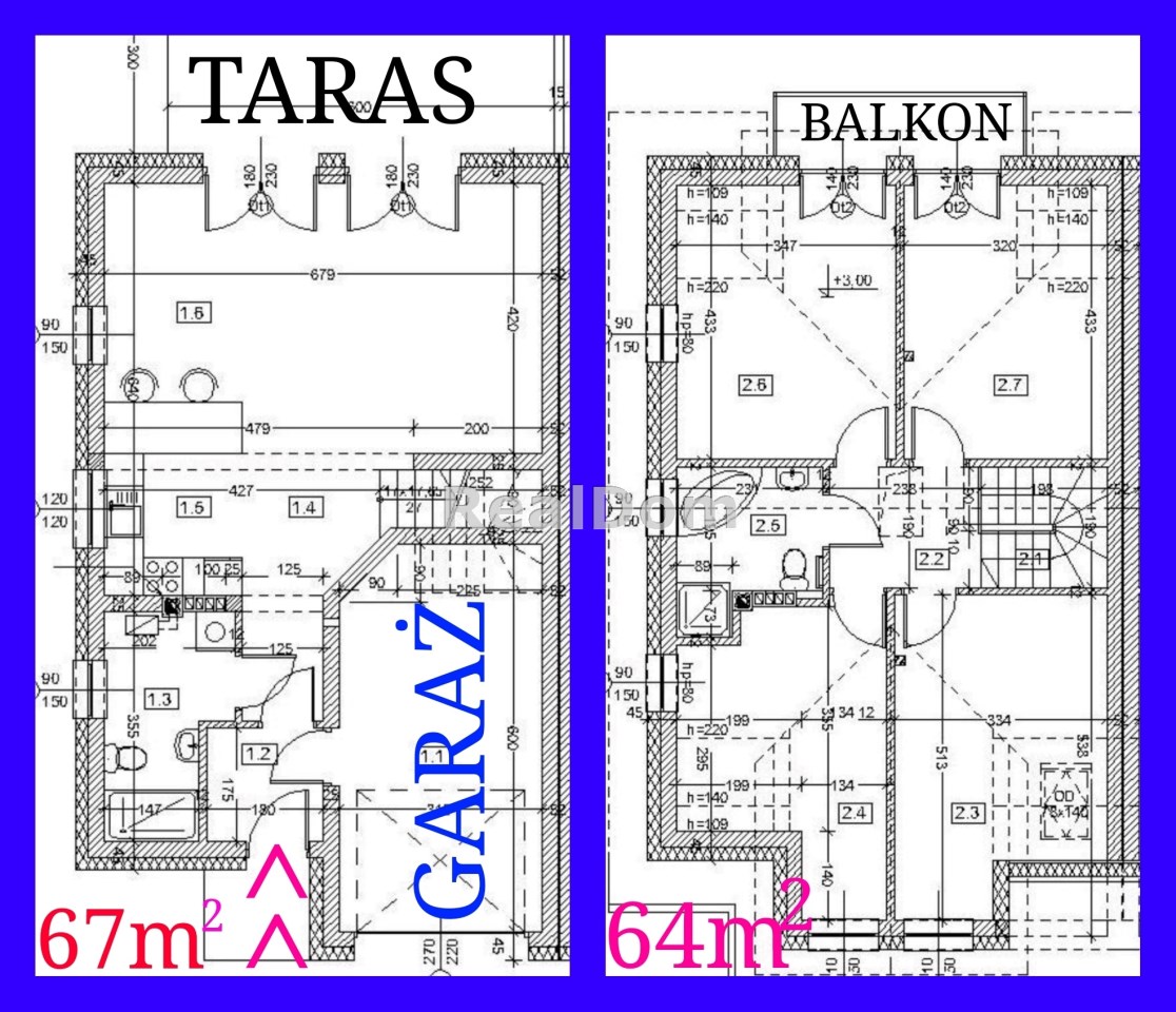 Garaż posiada ok 18 m2 powierzchni, salon z aneksem ok 34 m2, 4 sypialnie od 12 - 14 m2, łazienki 5 i 6 m2.