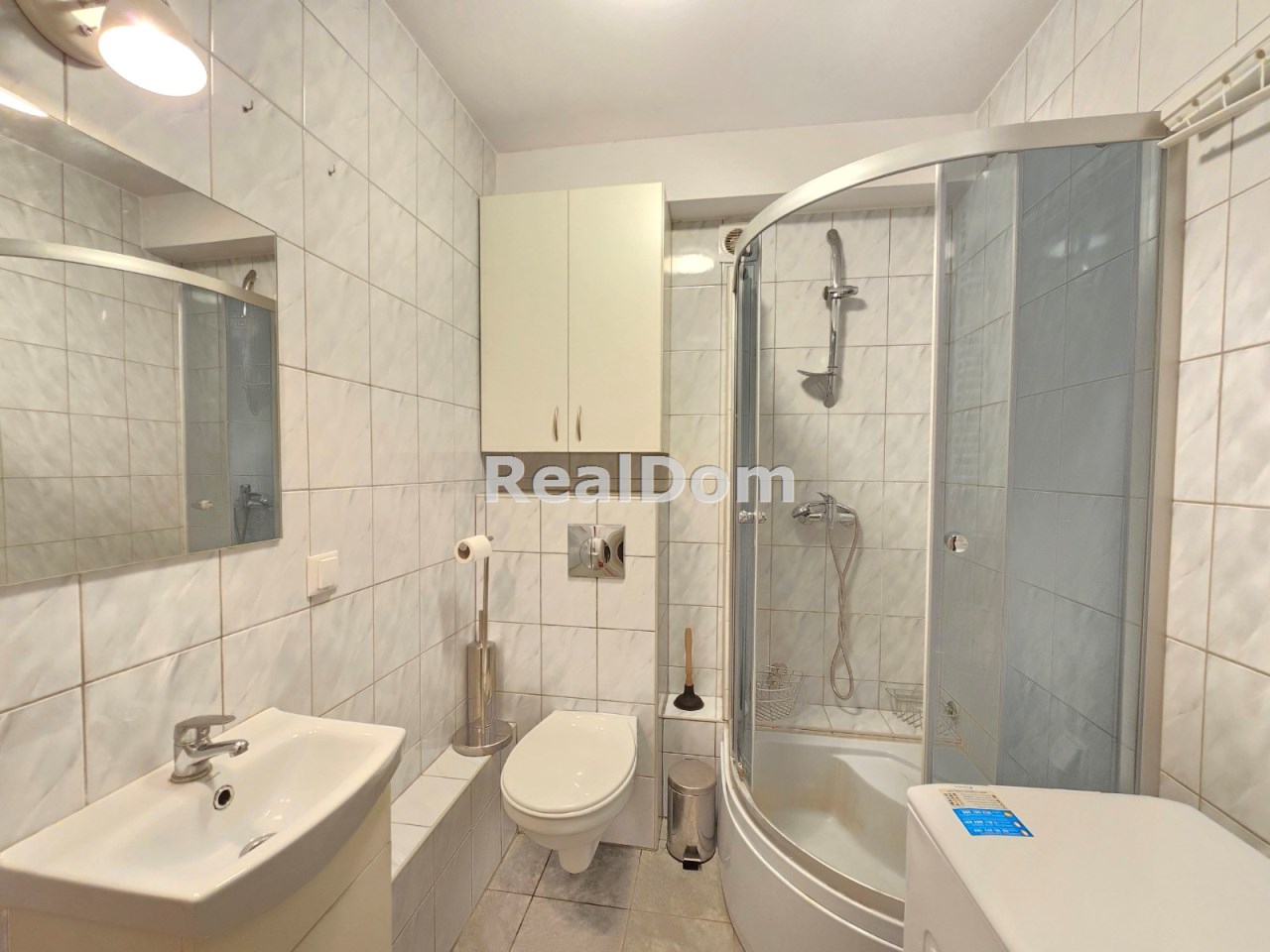 Łazienka z kabiną prysznicową i pralką