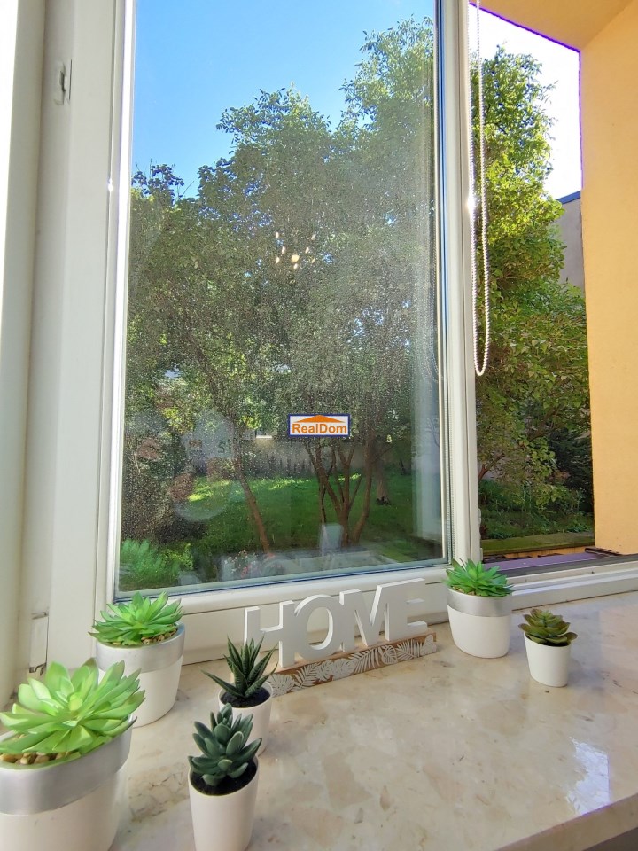 KOJĄCY WIDOK: Duże, podwójne okno skierowane na pięknie utrzymany, cichy ogród.