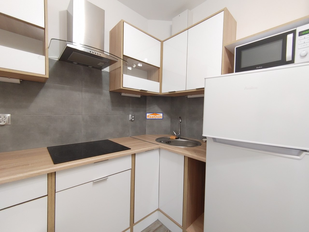 Wyposażenie kuchni: meble w zabudowie, płyta ceramiczna, lodówka z zamrażarką.