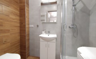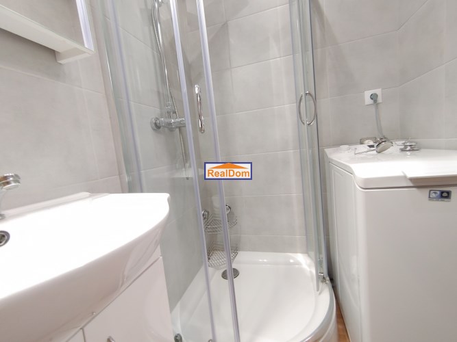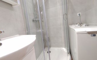łazienka z kabiną prysznicową. Na wyposażeniu jest pralka.